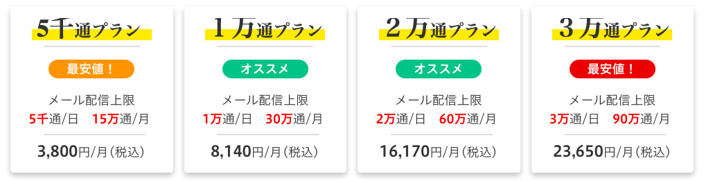 5千通プランであれば、1日5,000通までメルマガを送れます。このプランだと、月3,800円(税込)です。