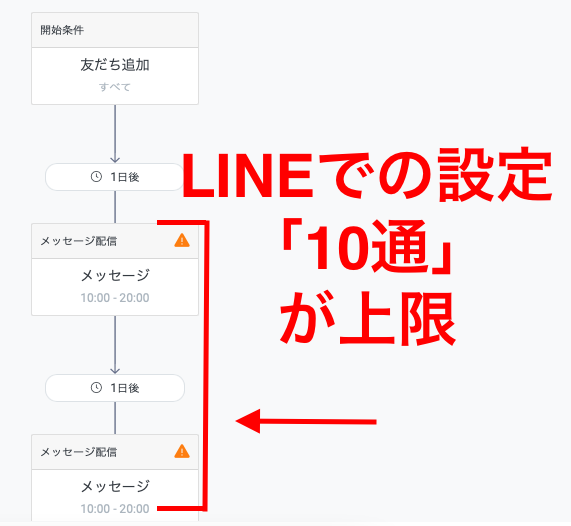 LINEの公式マイページでもステップメール機能は使えますが、「10通」しか設定することができません。また「1シナリオ」(=「10通1セット分」しかできない)です。
