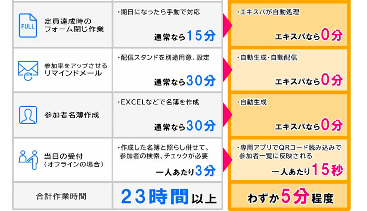 募集ページの作成から申し込み管理や参加者名簿作成、決済、当日の受付管理までエキスパで完結することができます。