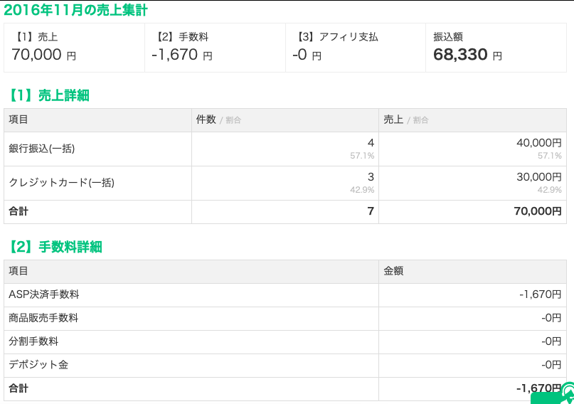 1万円の少人数セミナーを都内で開催したのですが、銀行振込が4人、クレジットカード決済が3人で、合計7件の決済、売上7万円で手数料は1,670円でした。