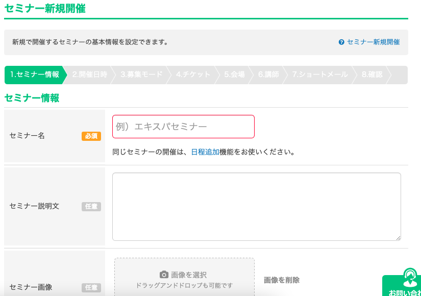 この「セミナー開催」では、セミナーを商品として販売することができます。セミナーの概要説明や会場の設定や料金の設定など、情報を一括で入力して、販売することができます。